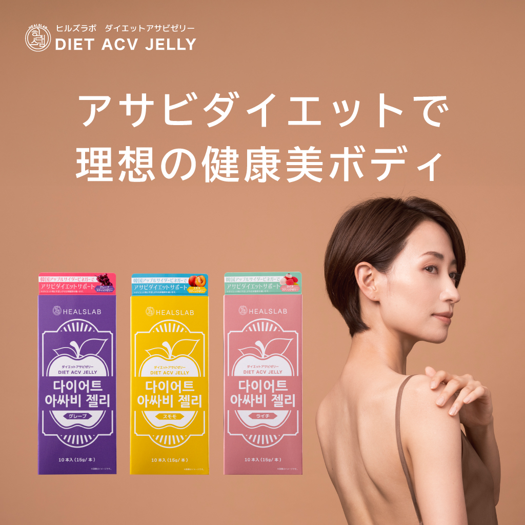 「HEALSLAB(ヒルズラボ)ダイエットアサビゼリー」に配合されているアップルサイダービネガーは、強い農薬や化学肥料を含まず身体にも環境にも優しいこだわりのイタリア産アップルを発酵させた果実酢で、歴史あるイタリア・トリノ発祥のビネガー業界において世界で唯一ロイヤルビネガーを授与されている原料を使用しています。原材料へのこだわりと、フルーティーで親しみやすい3種の味わい(スモモ・グレープ・ライチ)は無理なく日々のルーティンにプラスしやすいので、早速トレンド感たっぷりの“アサビダイエット”を試してみてはいかがでしょうか。※ダイエット時に不足しがちな栄養素を補います。